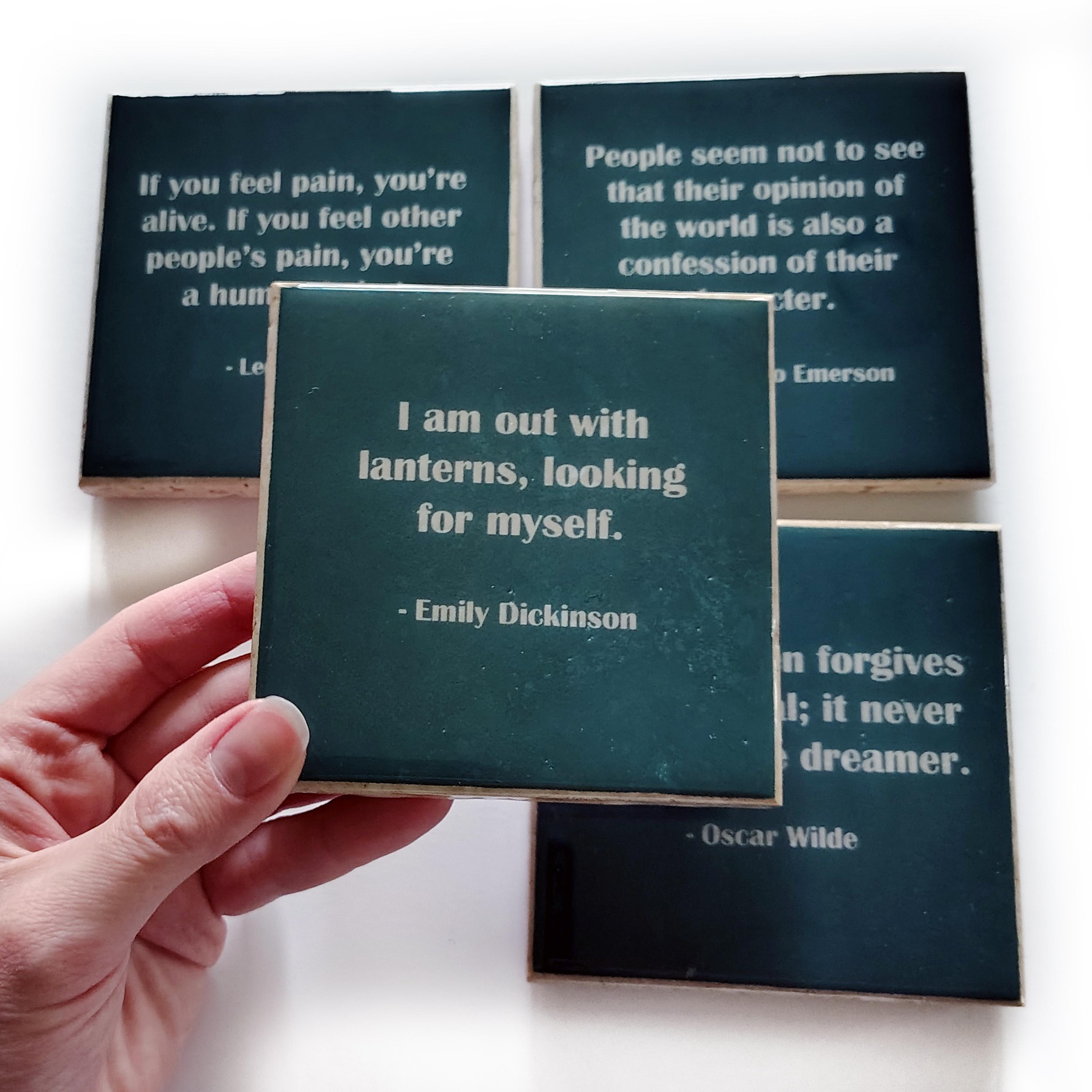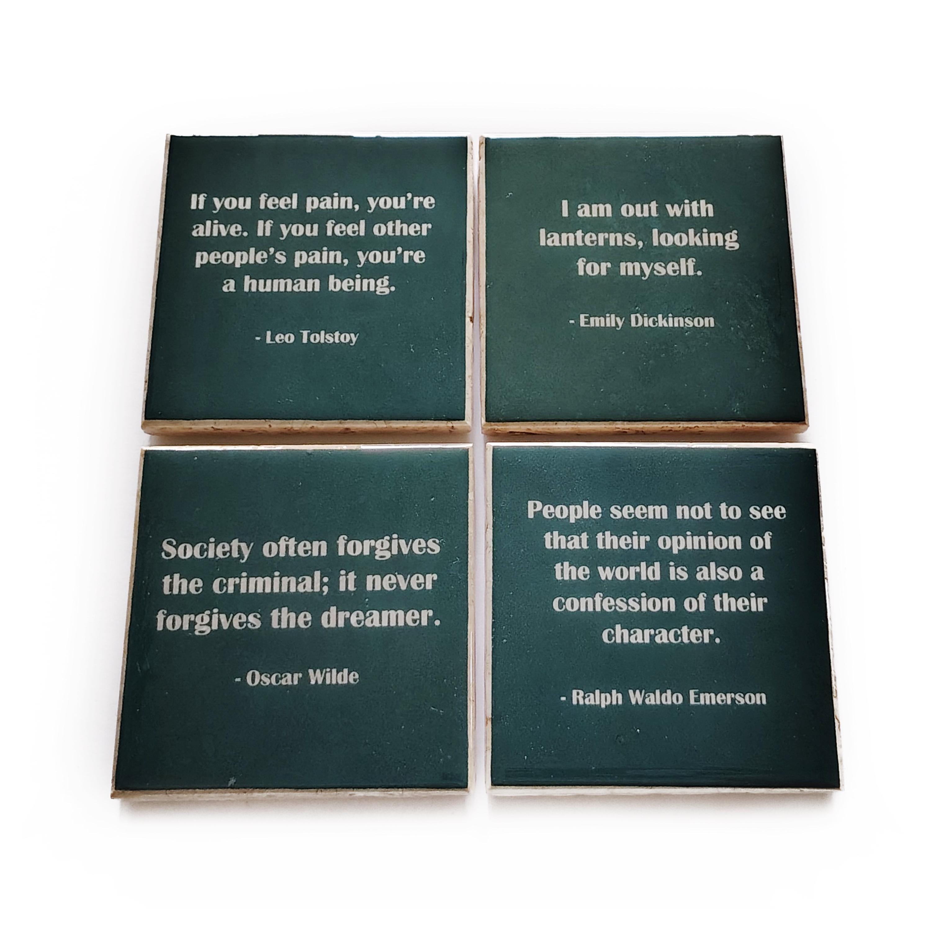 Literature Quote Coaster Set Edition II (4 Green Stone Coasters) Emerson, Dickinson, Tolstoy, Wilde